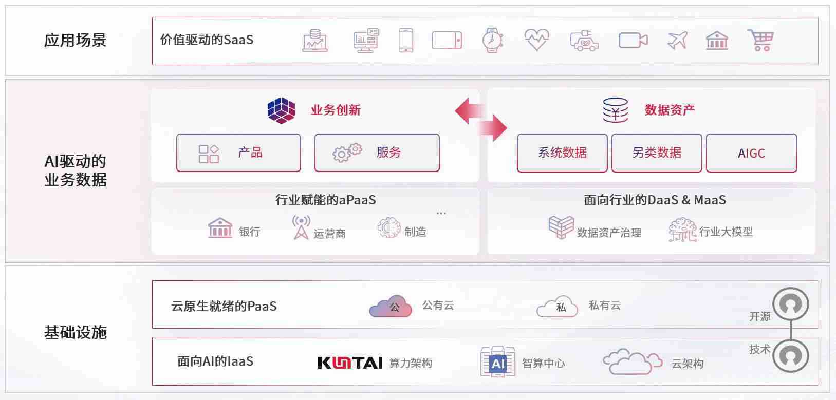 数字时代,,围绕企业数字化转型的关键要素,,,yd2333云顶电子游戏数码开创性的提出数云融合战略和技术体系框架,,着力在云原生、、、数字原生、、AI原生和信创产业上架构产品和服务能力,,,为处在不同数字化转型阶段的快消零售、、、、汽车、、、、金融、、、、医疗、、、、政企、、教育、、、、运营商等行业客户提供泛在的敏捷IT能力和融合的数据驱动能力,,构建跨界融合创新的数字业务场景和新业务模式,,,,助力企业级客户建立面向未来的核心能力和竞争优势,,,,全面推动社会的数字化、、、智能化转型升级。。