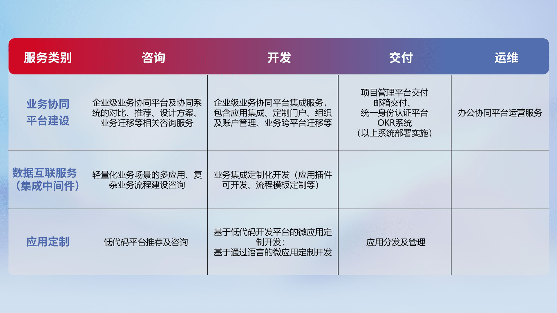 针对钉钉、、、企微、、IDaas等平台级产品提供产品的规划、、、方案、、、交付、、定制化开发等服务,,实现如统一协同办公、、、智能客户服务、、、、混合会议管理、、智能数据查询、、、等业务场景,,,实现数字化转型。。。